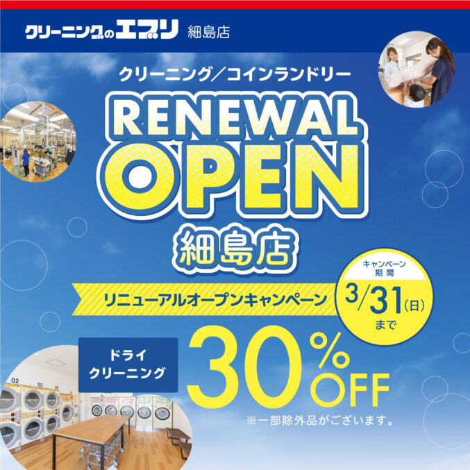 リニューアルオープニングキャンペーンとして、2024年3月31日(日)までドライクリーニング30%OFFを実施中!
